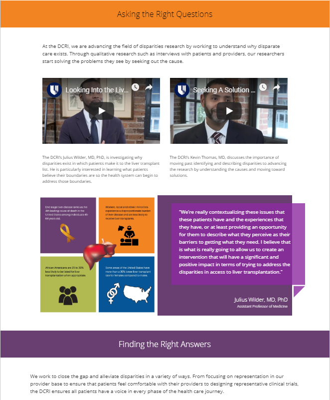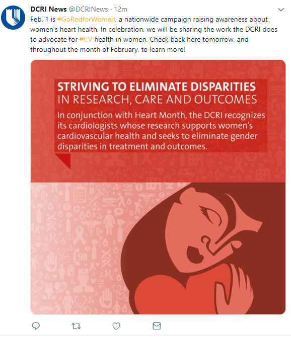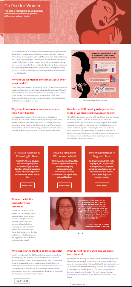 In conjunction with National Minority Health Month in April, we launched a campaign showcasing work from DCRI faculty in health disparities and in enhancement of minority health. Minority Health Month typically focuses on racial and ethnic minorities, but at the DCRI, we expanded our definition to include all populations historically underrepresented in clinical research–including women.