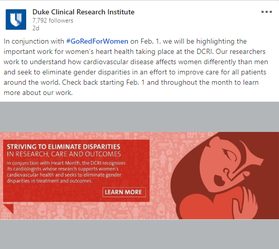 Then today, which was both the American Heart Association’s National Wear Red Day and campaign launch day, we sent out an email to more than 7,000 recipients to drive traffic to the campaign landing page. We will also be rolling out various kinds of social posts all month using content from the page.