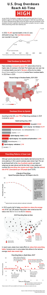 For our final project, we were tasked with creating an infographic that told a story and contained at least four distinct charts. Inspired by a story I heard on NPR about nationwide drug overdoses, I created the following infographic (also linked here – please click on link and click infographic once to enlarge).