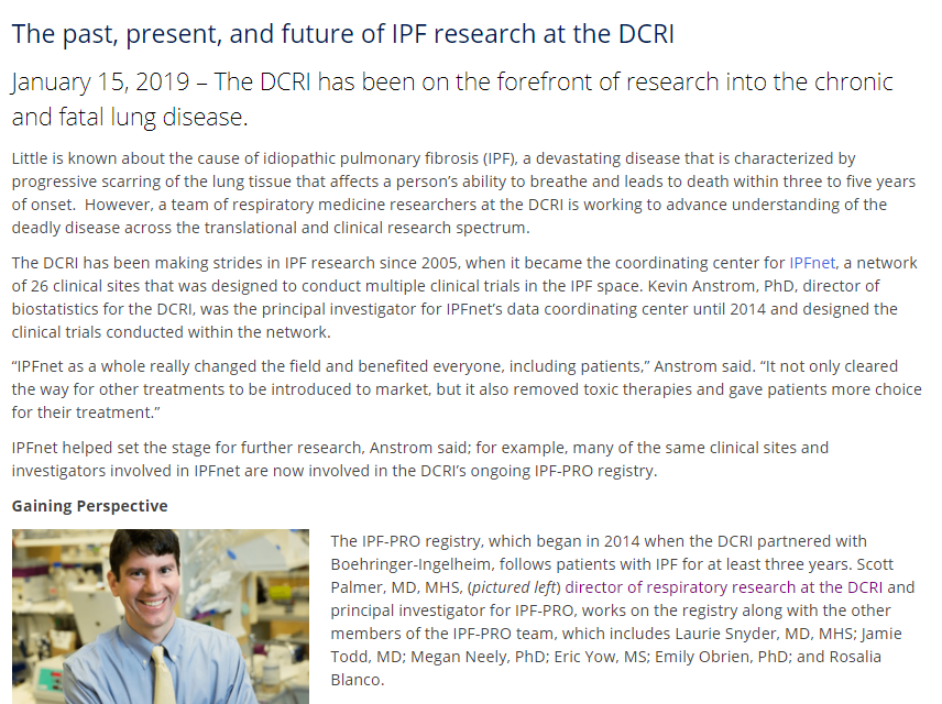 Researchers at the DCRI are working on a wide span of projects to advance understanding about idiopathic pulmonary fibrosis, a fatal lung disease.