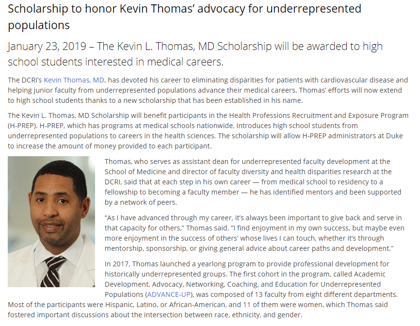 A DCRI faculty member who works to help junior faculty from underrepresented populations advance their careers was honored for his efforts with a scholarship created in his name.